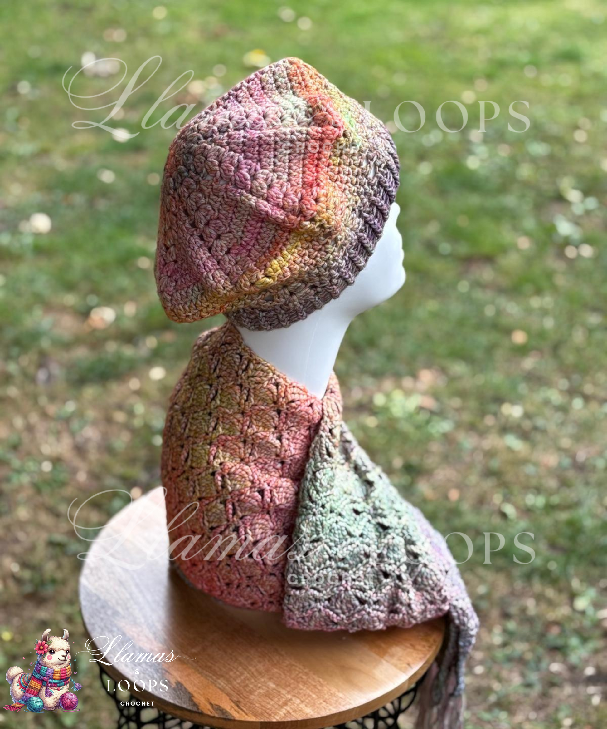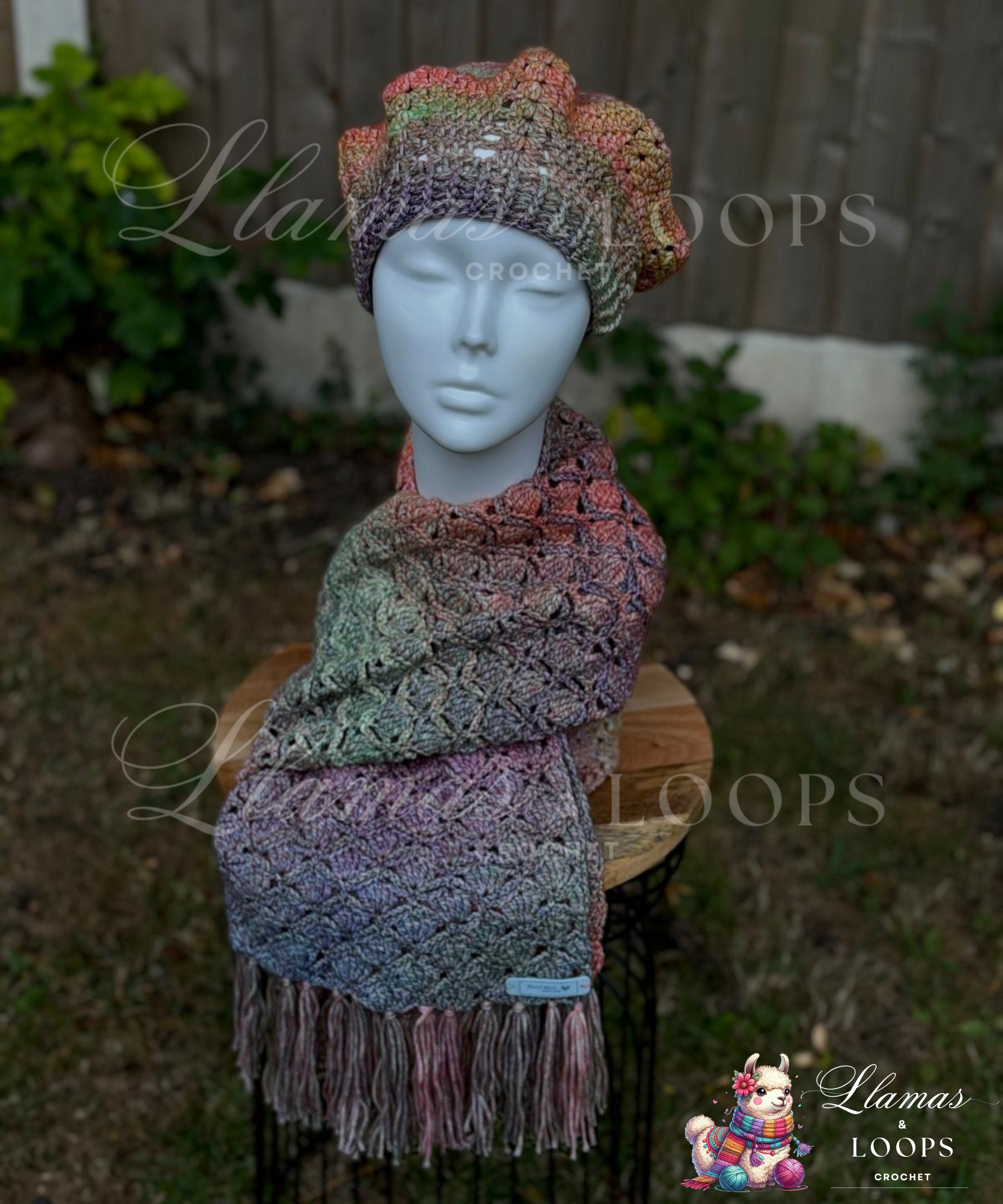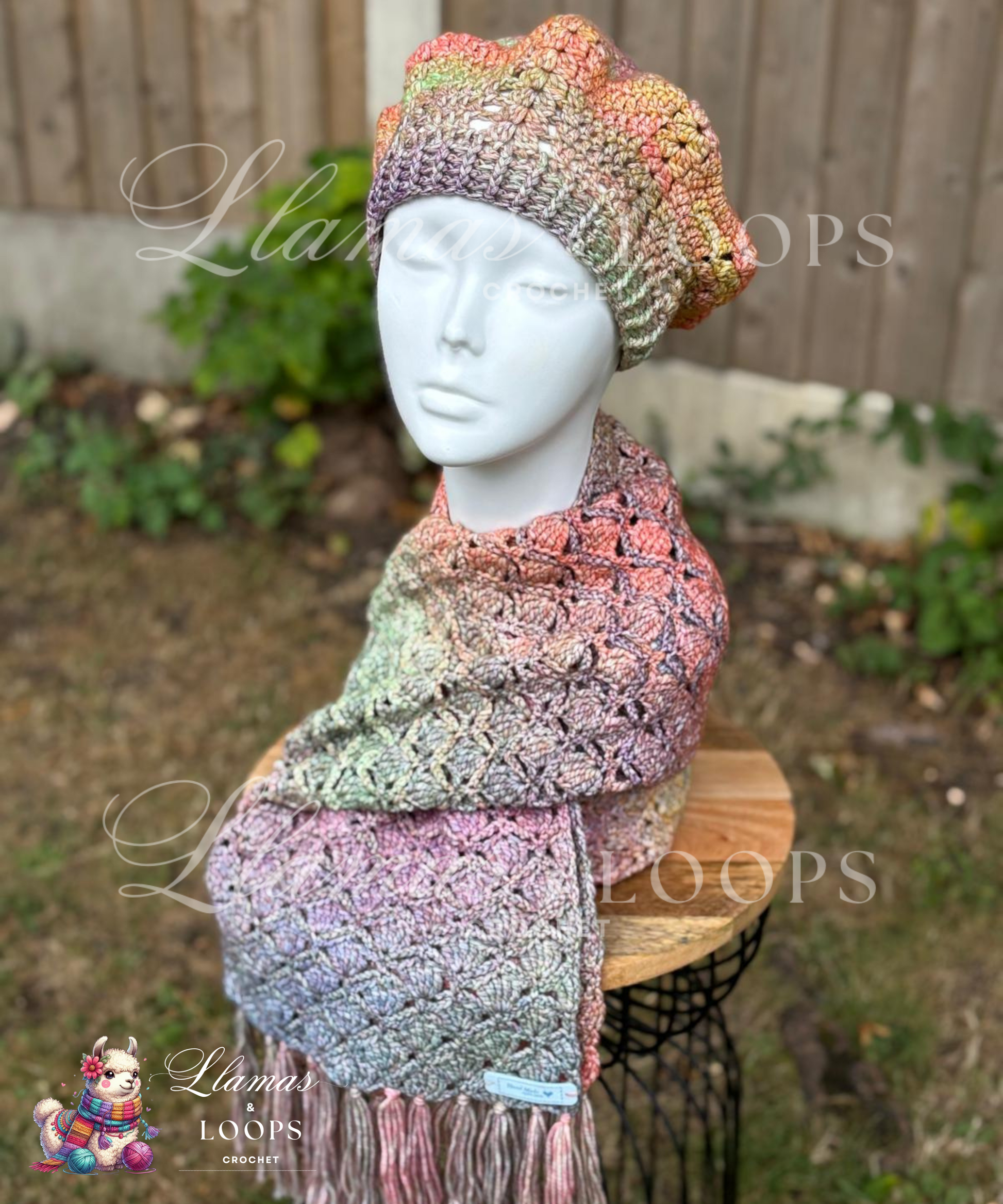 Made using the elegant shell stitch, each piece features soft, wavy textures that dance with color. The scarf offers lightweight warmth and a fluid drape, while the beret adds a stylish, carefree touch that turns any outfit into a statement.
