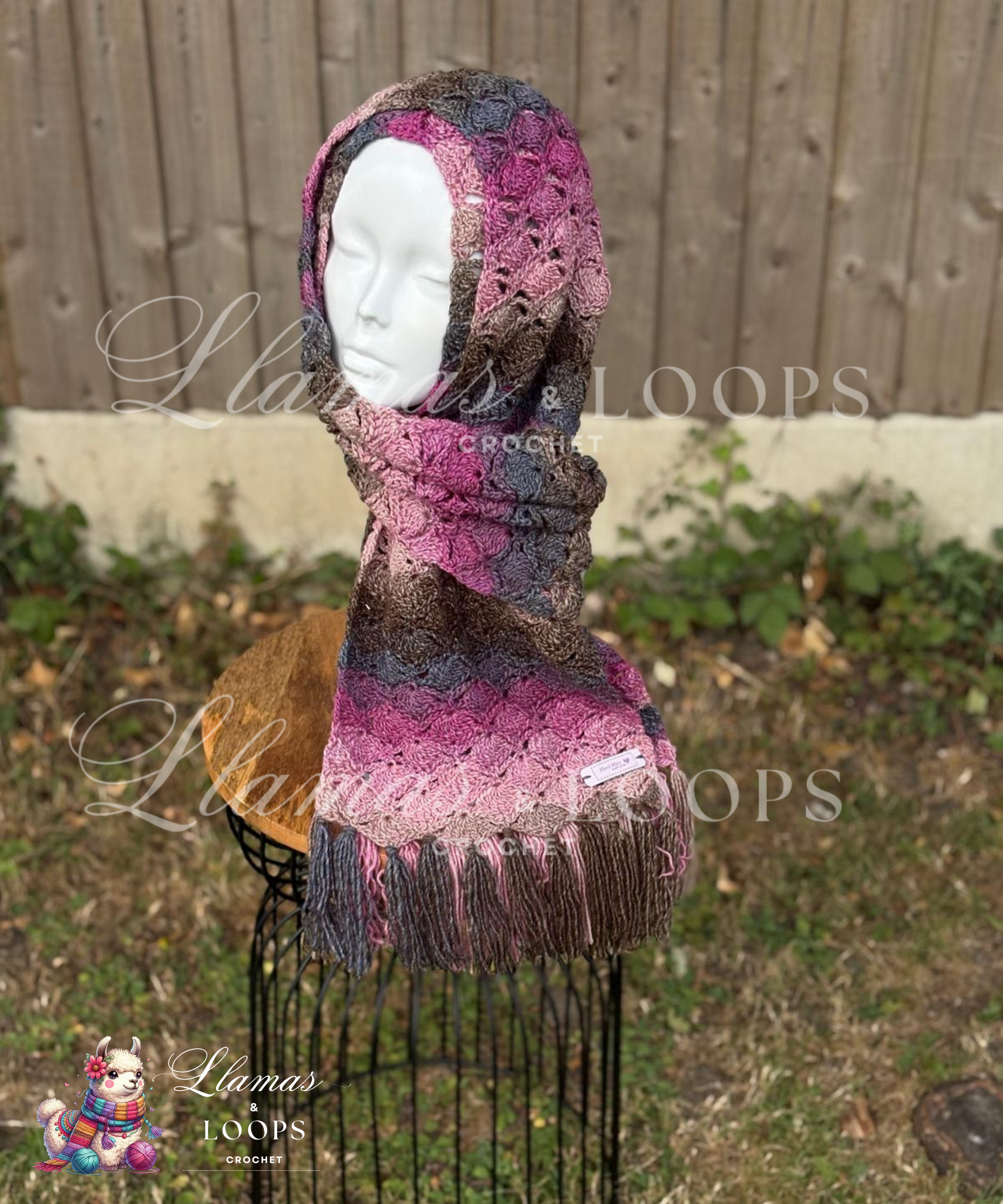 Plum Twilight Ombre Crochet Shell Stitch Scarf – Purple, Pink, Brown and Grey.