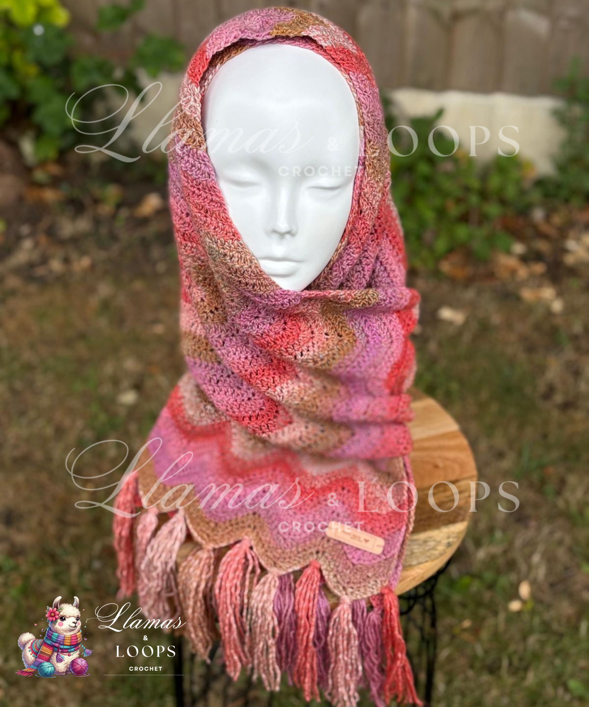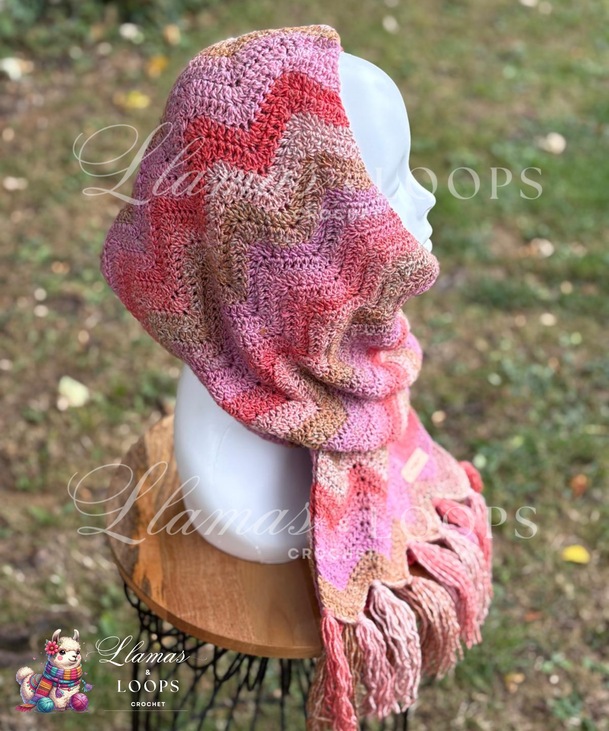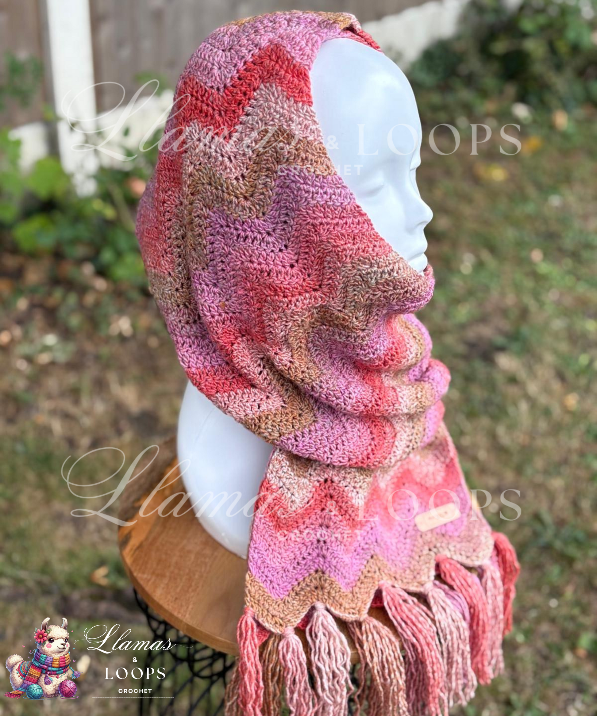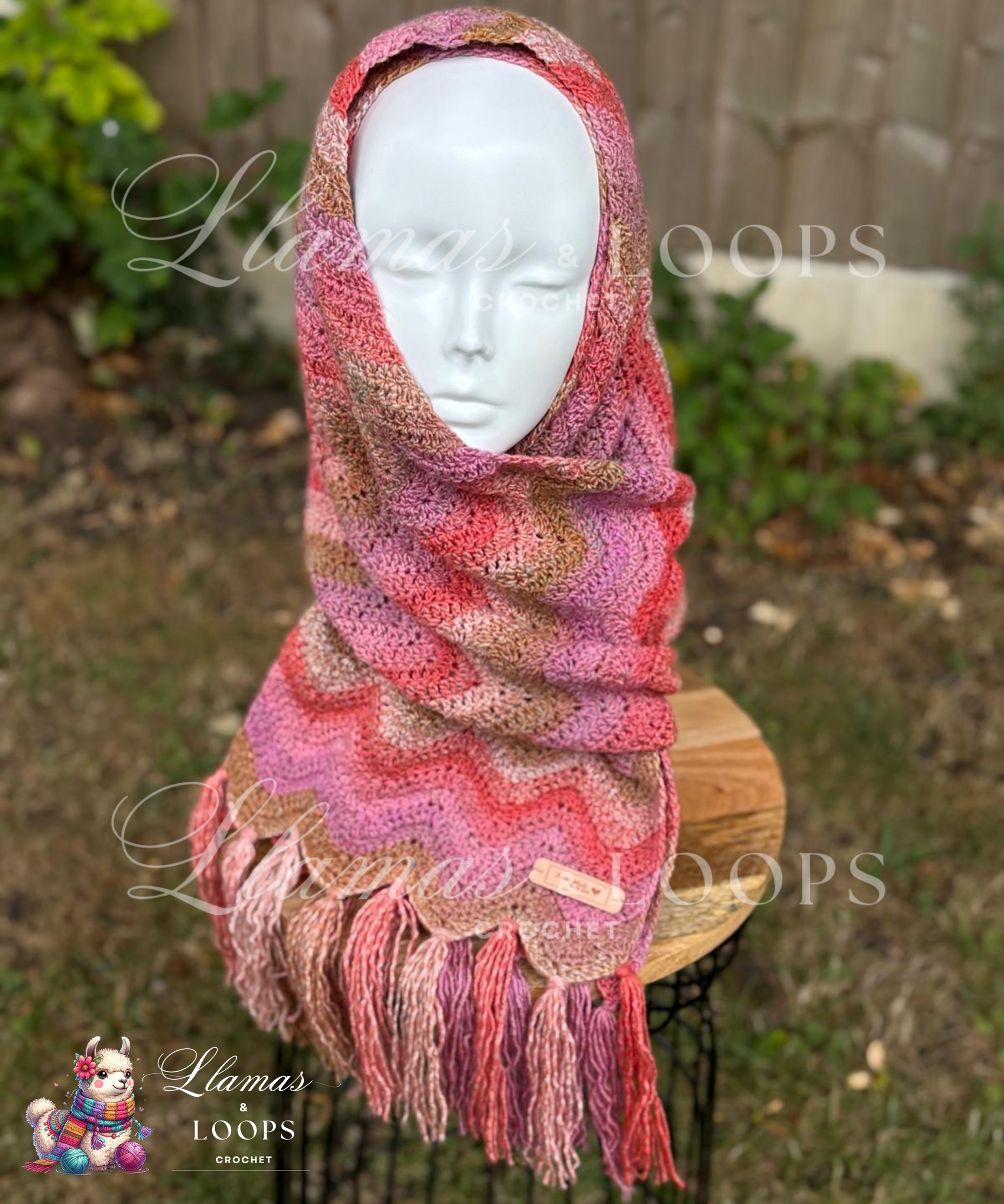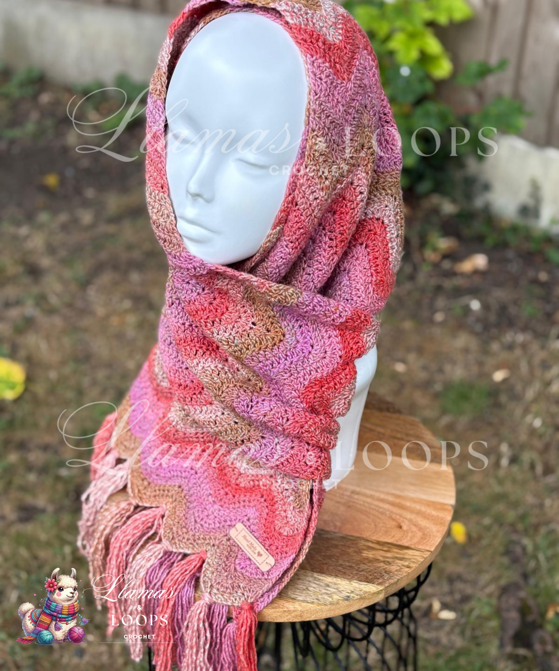 Wrap yourself in soft, desert-inspired charm with the Blush Canyon Waves Scarf. Handcrafted using the elegant Chevron Waves stitch, this scarf flows with gentle ripples in calming tones of pink, light red, and light brown — like sunlight washing over canyon cliffs at golden hour.