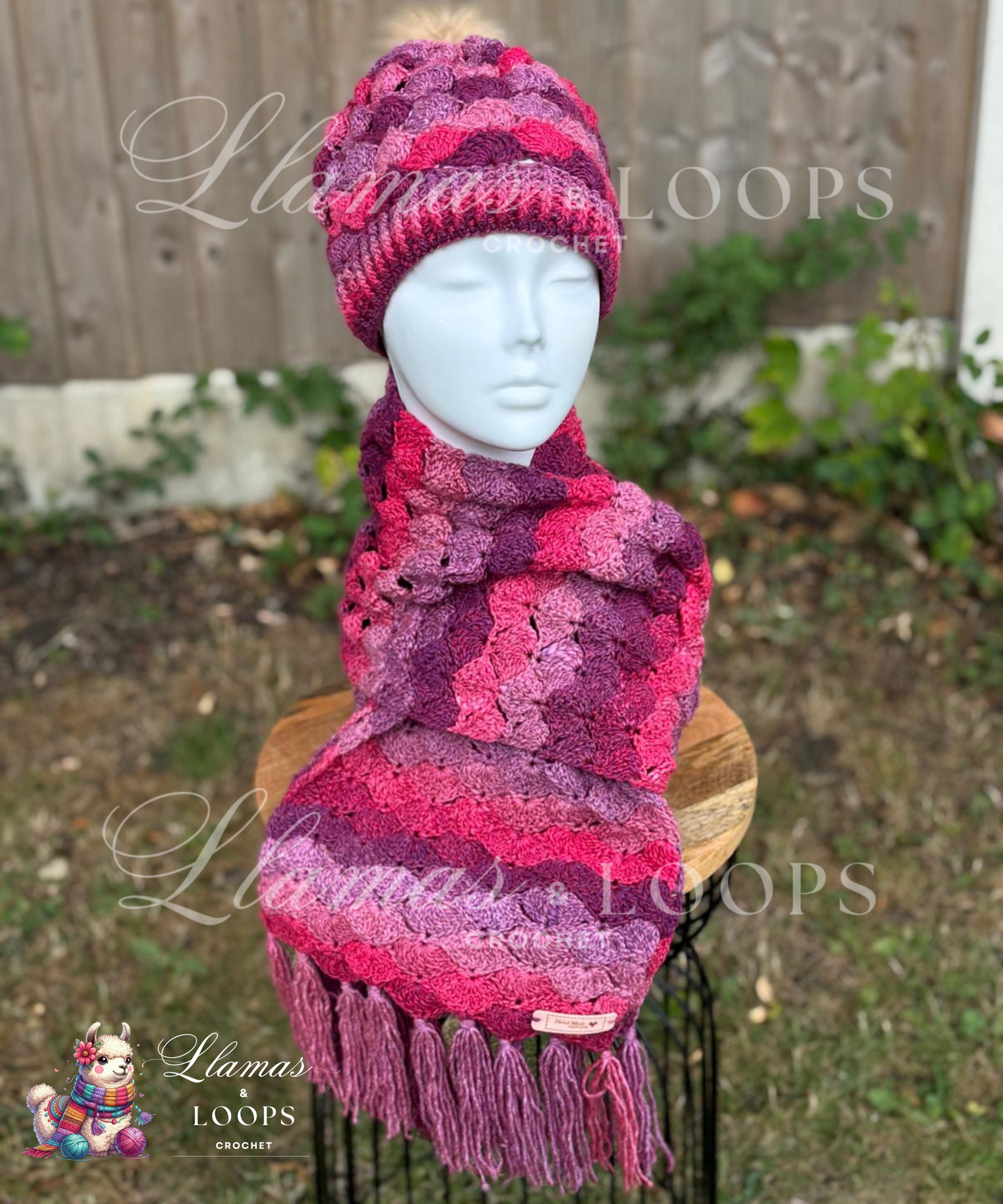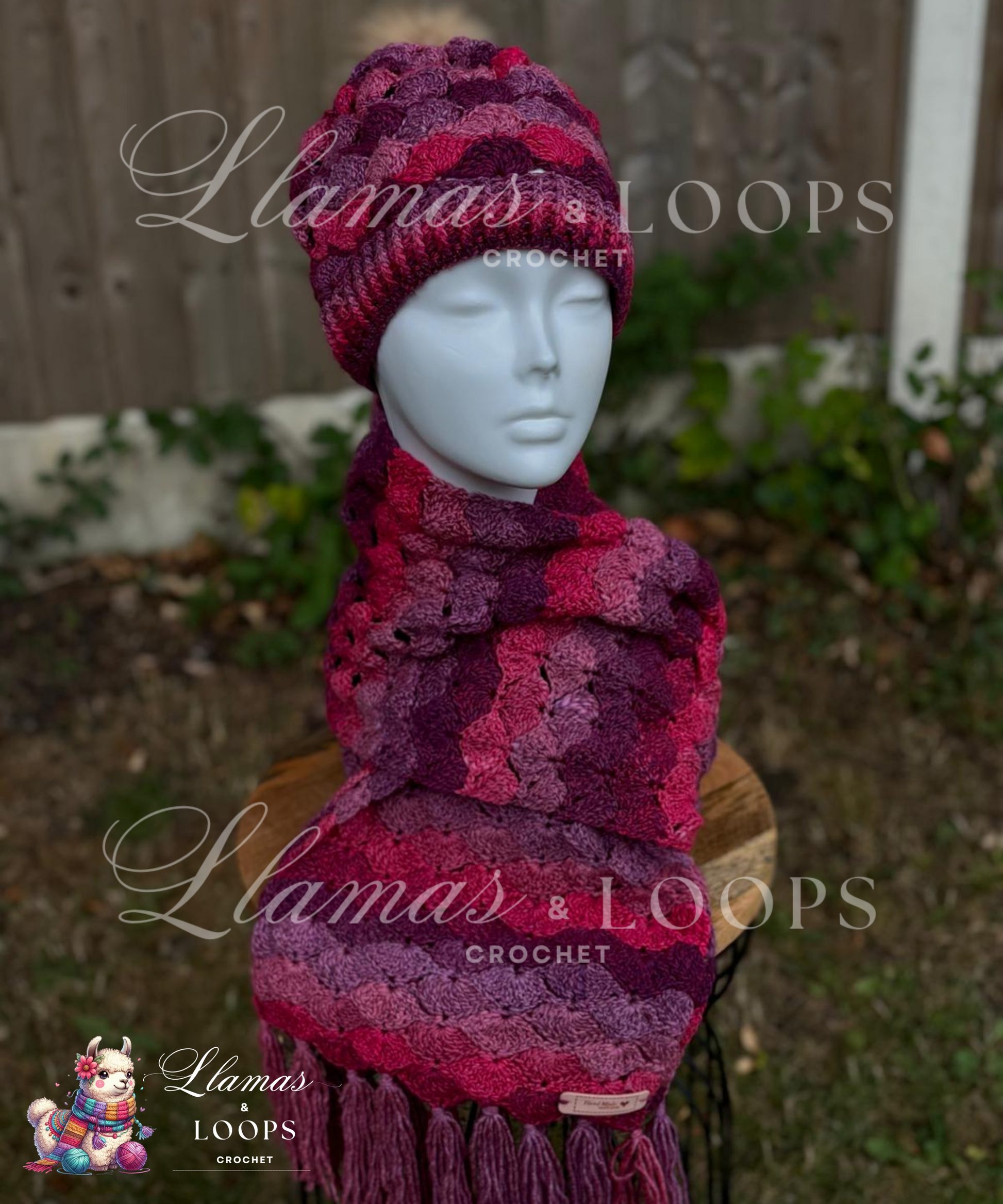 Brighten up chilly days with the whimsical charm of the Berry Whirl Shell Set — a cozy scarf and matching bobble hat, hand-crocheted in a swirling blend of rich red, royal purple, soft lilac, and pinkish hues.