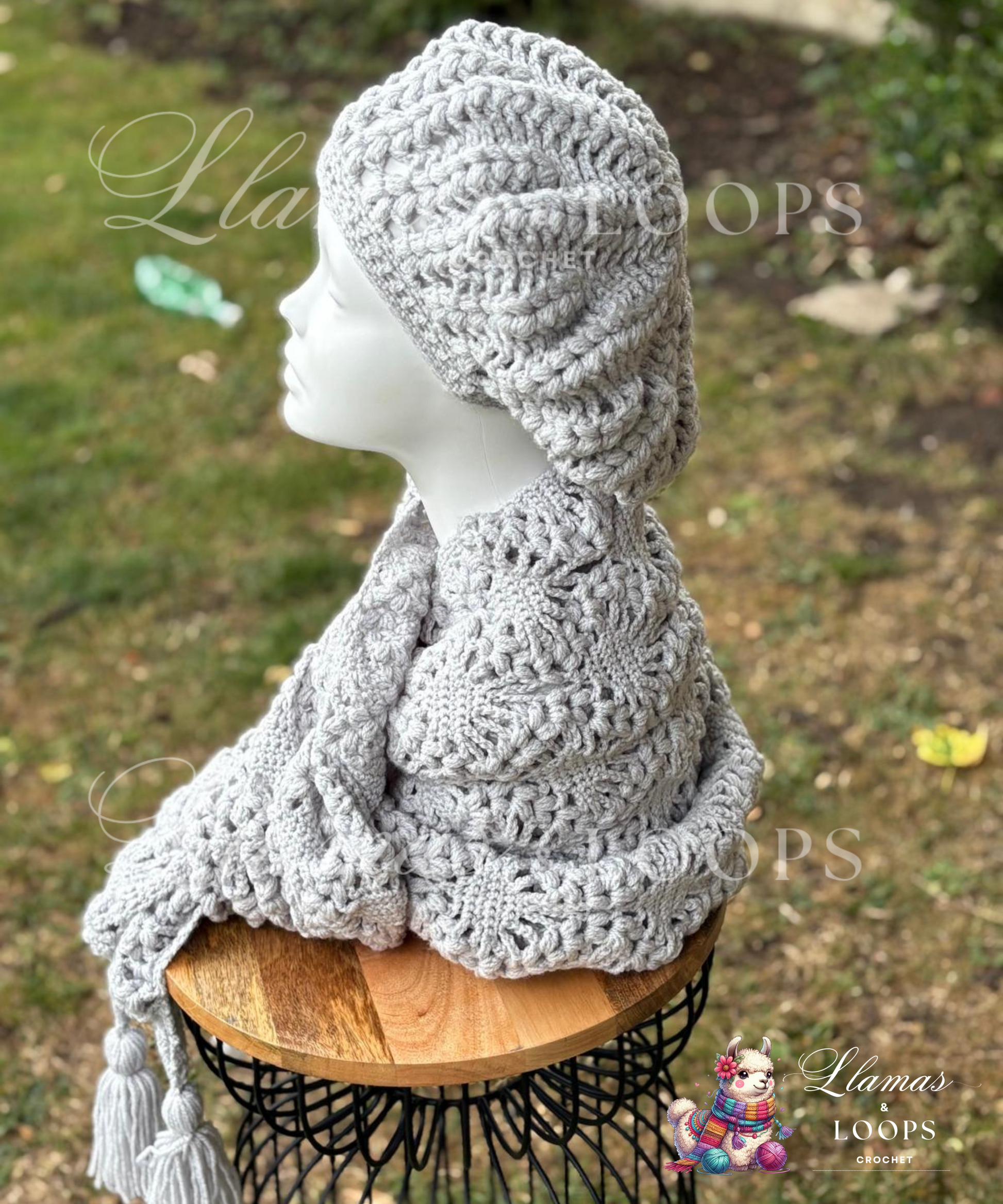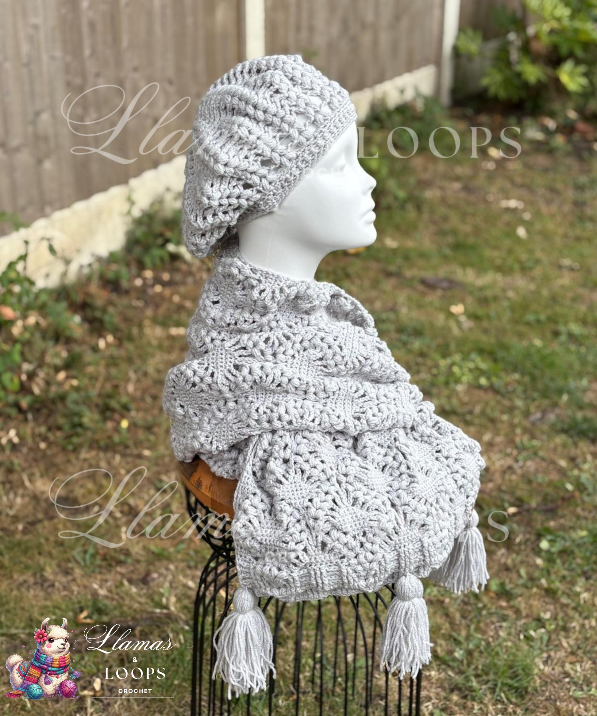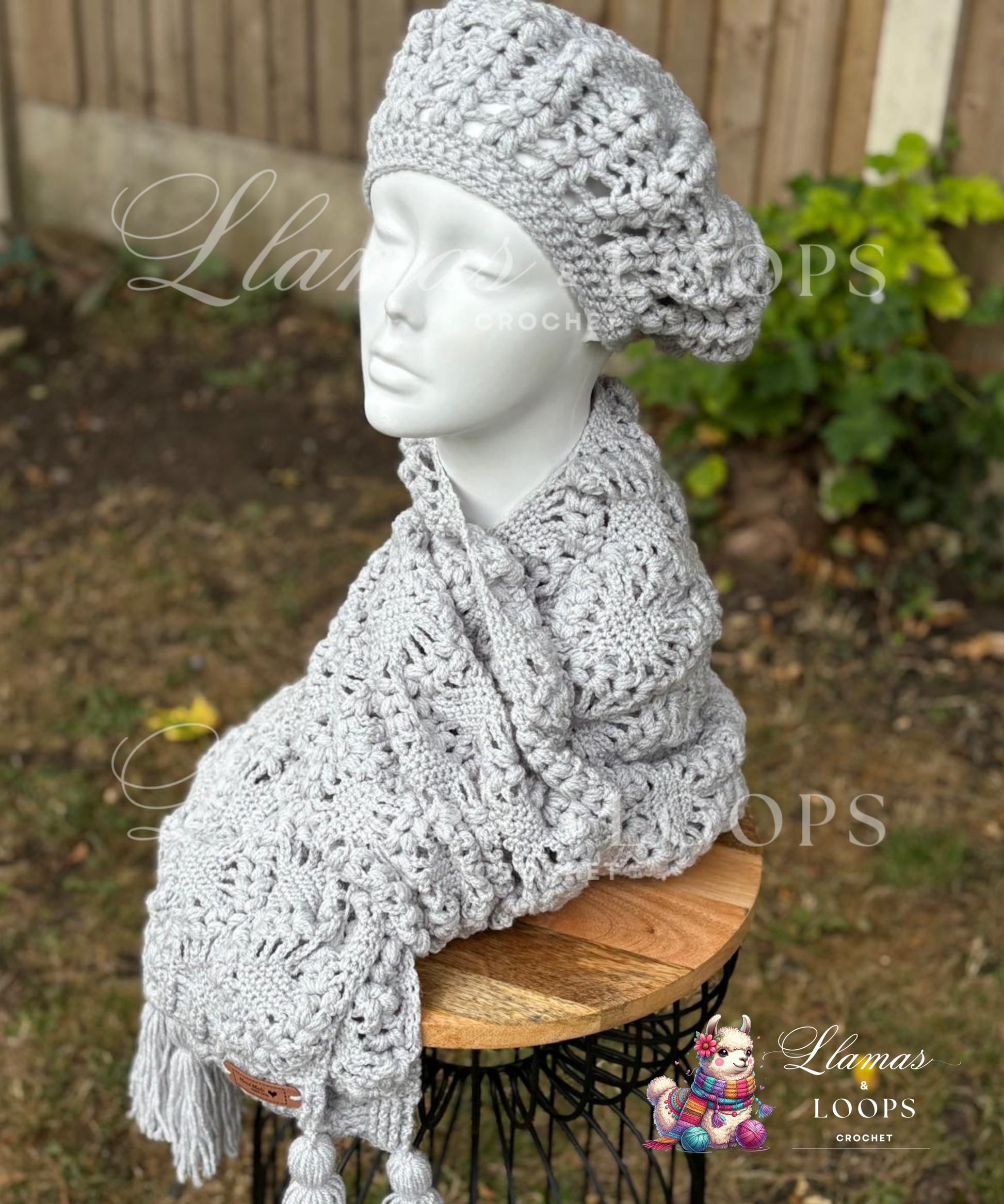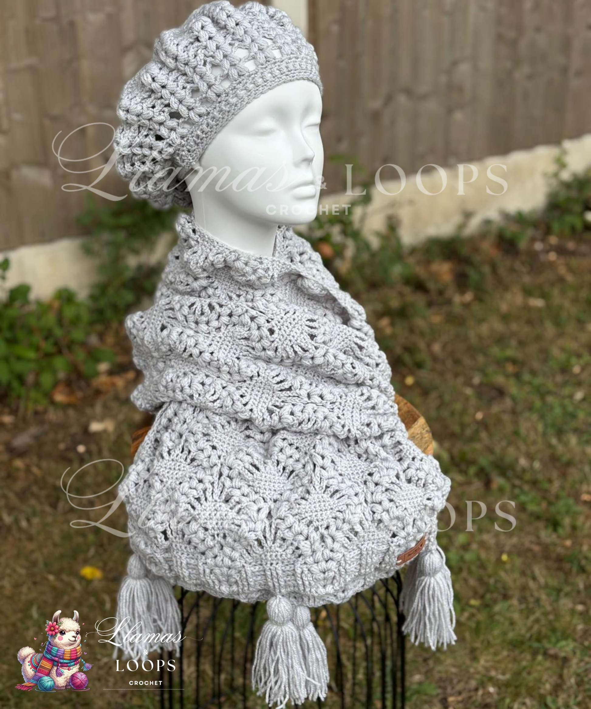 Made from lightweight yet cozy DK acrylic yarn in a versatile light grey, this set pairs effortlessly with any outfit — from casual coats to dressier layers. The stole drapes beautifully over the shoulders, adding warmth and softness with every wear, while the beret adds a classic, Parisian-inspired touch with a subtle, puffed texture that catches the eye.