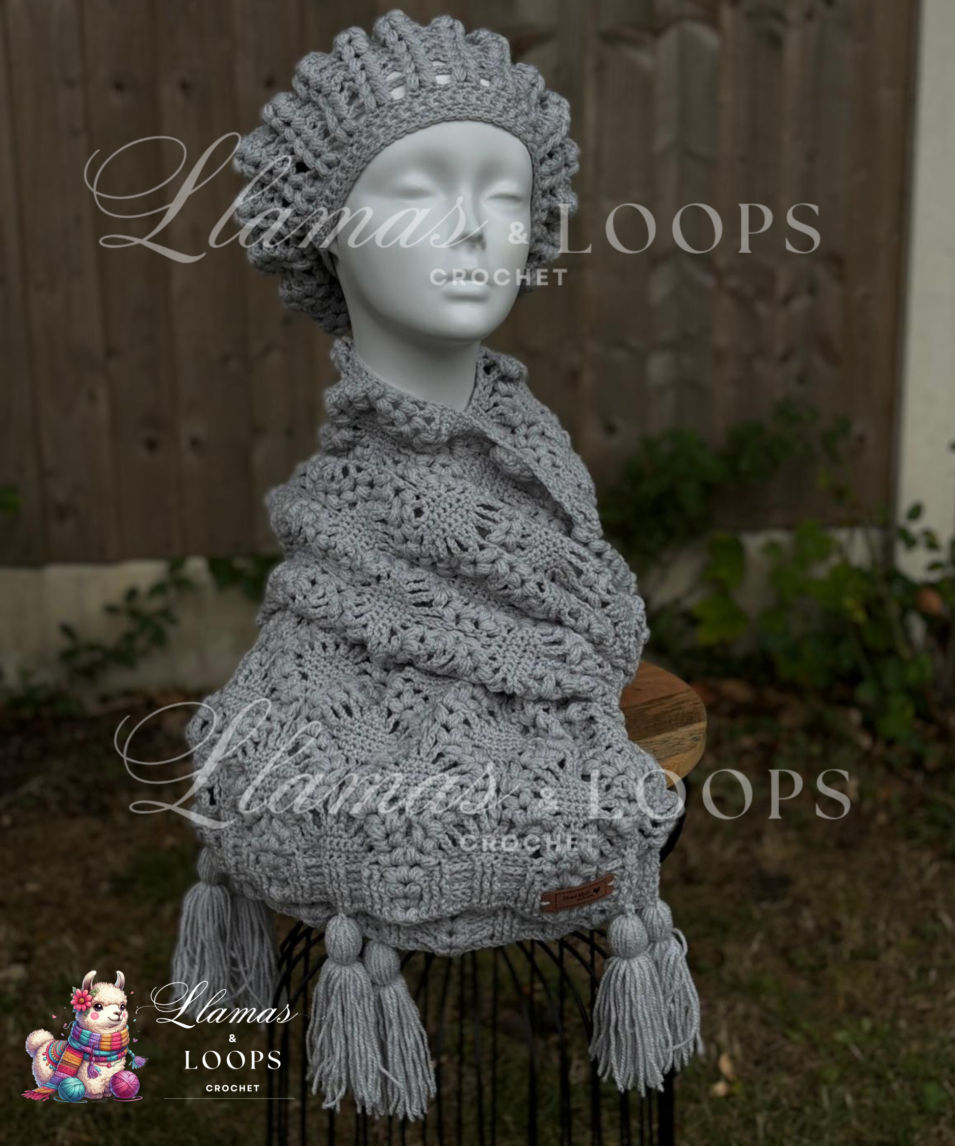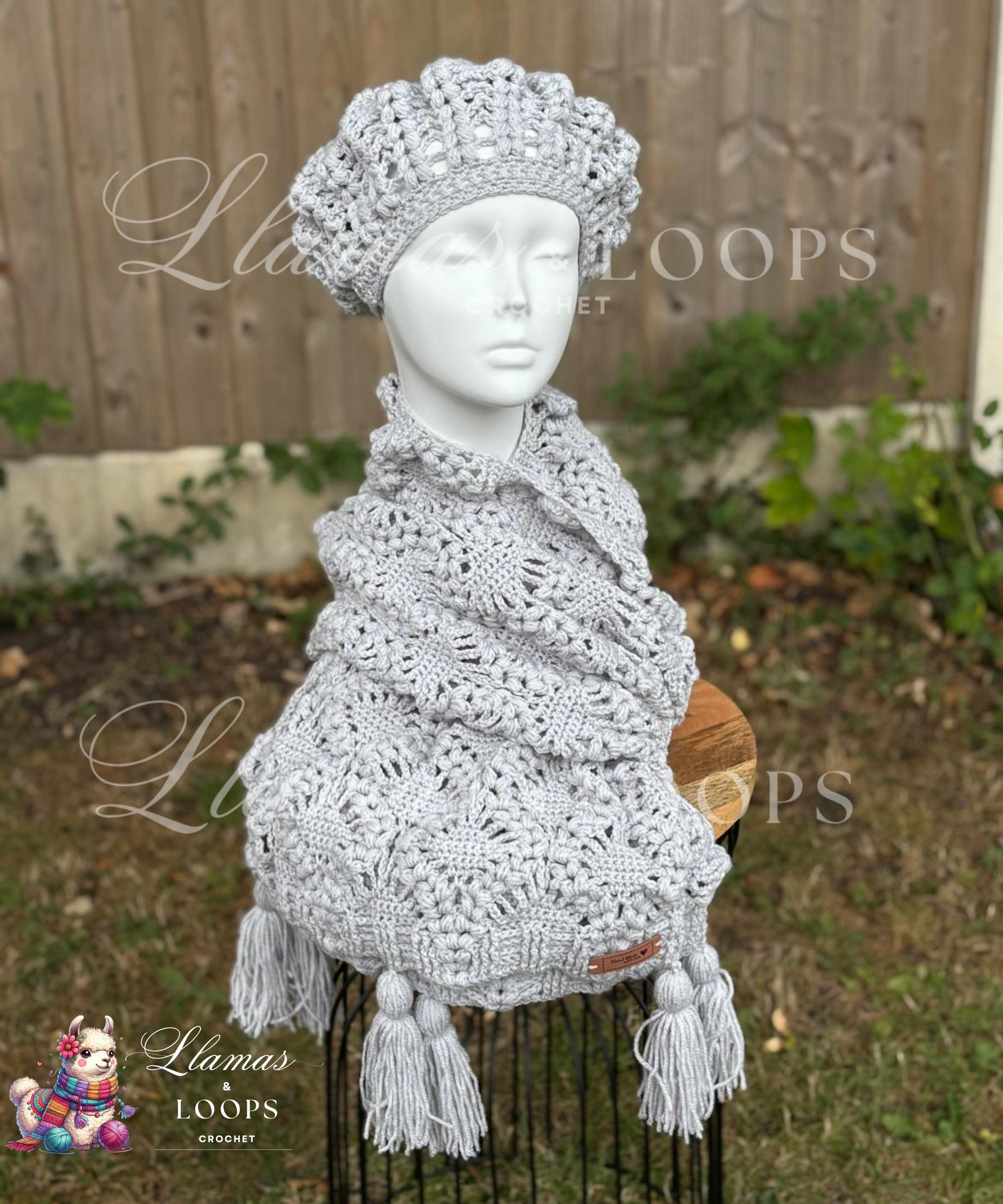 Soft as a cloud and gracefully understated, the Silver Whisper Puff Set brings timeless elegance to chilly days. This hand-crocheted set includes a flowing stole and a matching beret, both crafted with delicate puff stitches that add luxurious texture and volume without bulk.